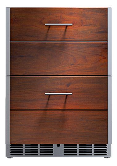 Arcadia Series: 24-inch wide, outdoor-rated, undercounter refrigerator, with two drawers. Drawers slide out on stainless steel ball bearings and glides. Oiled Ipe wood overlay drawers. 304 stainless steel. Appliance cabinets and back panels available.Read More